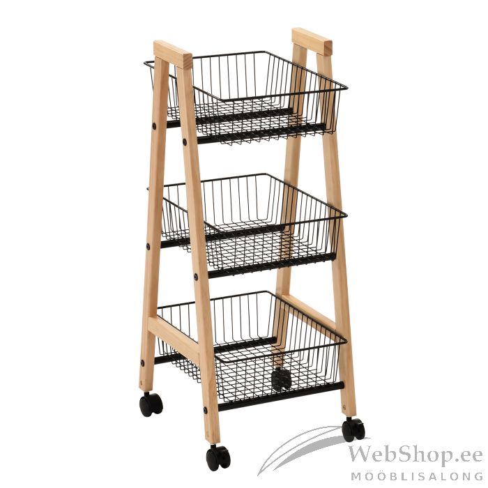 Riiul BREN must, 32x37xH81cm. Funktsionaalne kolmekordne riiul sobib hästi esikusse esemete hoiustamiseks kui ka panipaika või sahvrisse. Riiulil on rattad, mistõttu on seda mugav liigutada. Toote raam on valmistatud täismännipuidust ning on naturaalse tooniga. Riiuli kolm terastraadist korvi on kaetud musta pulbervärviga. Riiuli mõõdud on 32x37xH81cm.