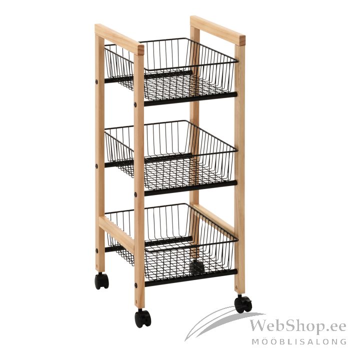 Riiul BREN must. Funktsionaalne kolmekordne riiul sobib hästi esikusse esemete hoiustamiseks kui ka panipaika või sahvrisse. Riiulil on rattad, mistõttu on seda mugav liigutada. Toote raam on valmistatud täismännipuidust ning on naturaalse tooniga. Riiuli kolm terastraadist korvi on kaetud musta pulbervärviga. Riiuli mõõdud on 32x37xH81cm.