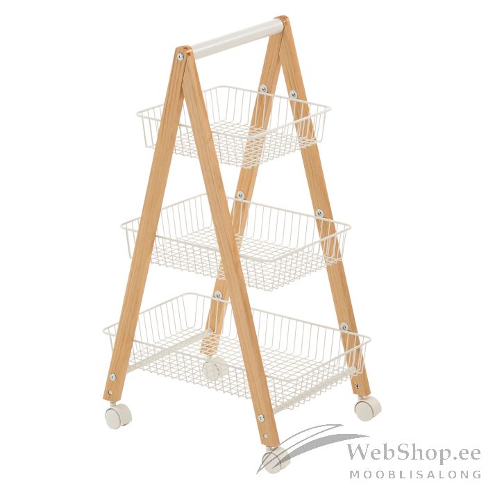 Riiul BREN valge, 48x32x79cm. Funktsionaalne kolmekordne riiul sobib hästi esikusse esemete hoiustamiseks kui ka panipaika või sahvrisse. Riiulil on rattad, mistõttu on seda mugav liigutada. Toote raam on valmistatud täismännipuidust ning on naturaalse tooniga. Riiuli kolm terastraadist korvi on kaetud valge pulbervärviga. Riiuli mõõdud on 48x32xH79cm.