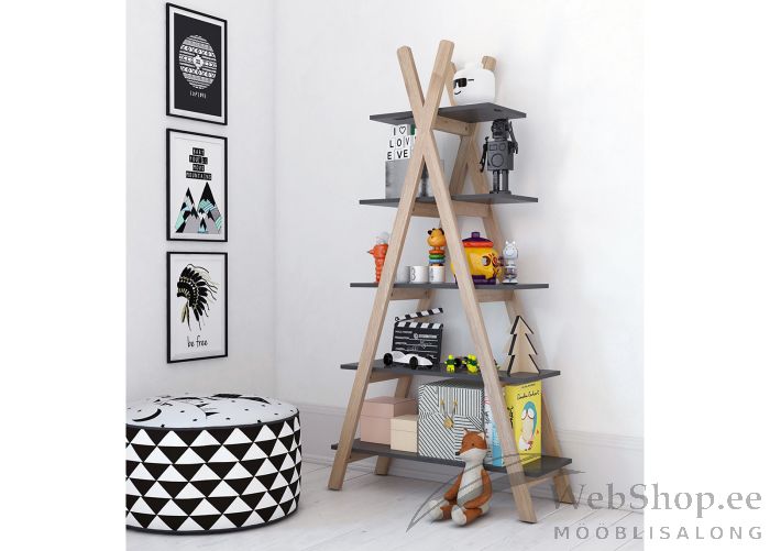 Telgi kujuline riiul. Jalad on naturaalsest männipuidust. 5 riiulit on halli värvi MDF-mööbliplaadist.