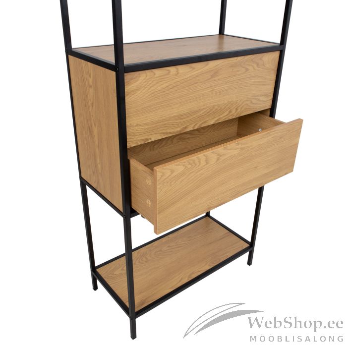 Riiul HEDVIG sahtliga 64x30xH178cm, saar/must. Riiulid ja sahtel: saare dekooriga melamiinplaat. Riiuli raam on valmistatud metallist ja viimistletud musta pulbervärviga.