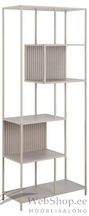 Riiul on visuaalselt atraktiivne tänu asümmeetrilistele detailidele. Kergesti hooldatav pind. Riiul on ideaalne koht raamatute, mängude ja dekoratiivesemete hoidmiseks. Toode on valmistatud hallist pulbervärvitud terasest. Riiulid on hallist melamiinist. Mõõdud 77x35xH185cm.