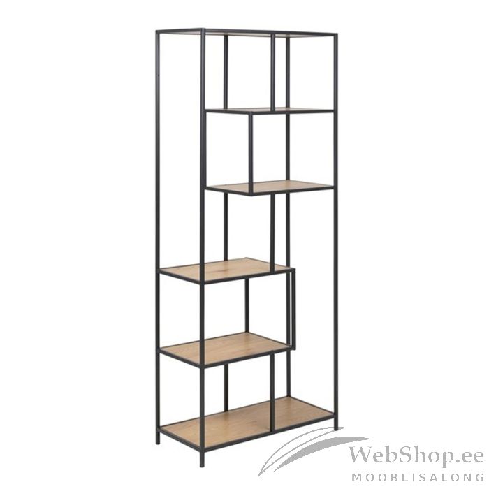 Riiul SEAFORD 77x35xH185cm, metsik tamm/must. Maitsekat ja praktilist riiulit on võimalik kasutada erinevates ruumides asjade mugavaks hoiustamiseks. Riiulid on valmistatud lamineeritud kattega mööbliplaadist. Värvus on metsik tamm. Raam on valmistatud musta värvi metallist. Toote mõõdud on 77x35xH185cm.