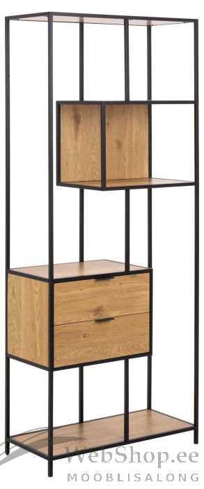 Riiul on visuaalselt atraktiivne tänu toonide kombinatsioonile ja asümmeetrilistele detailidele. Riiulil on 2 sahtlit ja lisapinda pakkuvad riiulid. Pinnad on kergesti hooldatavad. Riiul on ideaalne koht raamatute, mängude ja dekoratiivesemete hoidmiseks. Toode on valmistatud mattmustast pulbervärvitud terasest. Sahtlid ja riiulid on valmistatud tamme melamiinist. Mõõdud 77x35xH185cm.