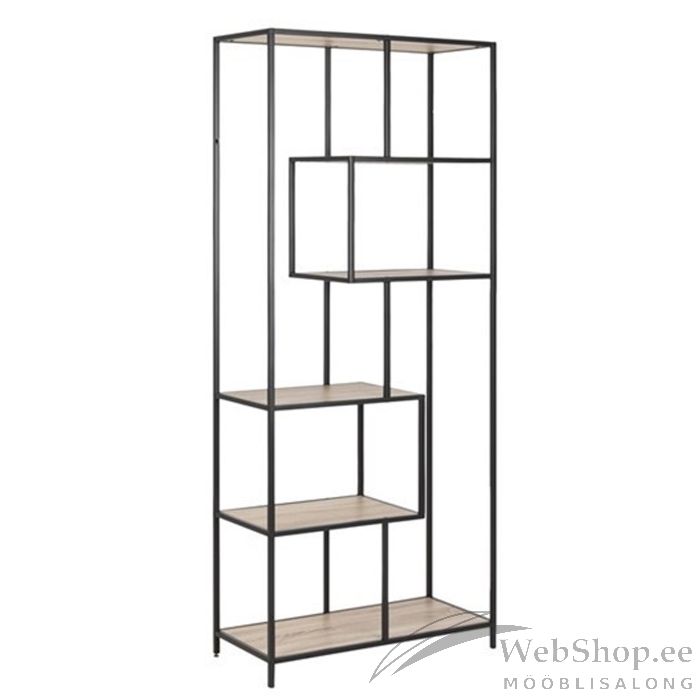 Riiul SEAFORD 77x35xH185cm, sonoma tamm. Maitsekat ja praktilist riiulit on võimalik kasutada erinevates ruumides asjade mugavaks hoiustamiseks. Riiulid on valmistatud lamineeritud kattega mööbliplaadist. Värvus on sonoma tamm. Raam on valmistatud musta värvi metallist. Toote mõõdud on 77x35xH185cm.