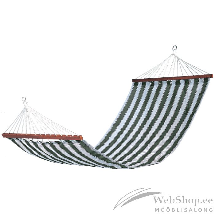 Rippkiik TIINA rohelisetriibuline. Rippkiik pakub ideaalse võimaluse lõdvestumiseks. Lamamisosa on valmistatud textiline materjalist, mis on vastupidav ja kergesti puhastatav. Kiike on võimalik paigaldada kahe puu, posti või seina vahele. Samuti on võimalik kiige üles riputamiseks kasutada kandejalga. Lisavarustusena on võimalik soetada universaalne alus rippkiigele koodiga 13237. Rippkiige mõõdud on 200x100cm ning maksimaalne kandevõime on 120kg. HOOLDUS: kiike ei tohiks jätta pikemaks ajaks päikese või vihma kätte. Kanga ja nööride vastupidavus väheneb UV-kiirguse ja liigniiskuse mõjul ning värvid tuhmuvad. Kiike peaks hoiustama kuivas ja varjulises ruumis. HOIATUS: toode pole mõeldud kasutamiseks tugeva tuule ja vihma korral.