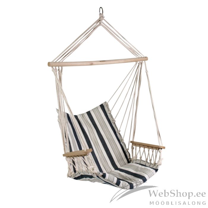 Ripptool HIP sinisetriibuline. Ripptool pakub ideaalse võimaluse lõõgastumiseks. Iste on valmistatud puuvillasest materjalist. Kiige iste on mugava polsterdusega. Ripptoolile on võimalik lisavarustusena juurde soetada universaalne alus koodiga 13236. Istme mõõdud on 60x42cm ja seljatugi 60x60cm. Käetugi on valmistatud tumedast puidust ning on 38cm pikk. Ripptooli kandevõime on 120kg. HOOLDUS: ripptooli ei tohiks jätta pikemaks ajaks päikese või vihma kätte. Kanga ja nööride vastupidavus väheneb UV-kiirguse ja liigniiskuse mõjul ning värvid tuhmuvad. Toodet peaks hoiustama kuivas ja varjulises ruumis. HOIATUS: toode pole mõeldud kasutamiseks tugeva tuule ja vihma korral.