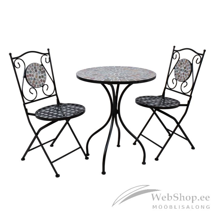 Rõdukomplekt CHECKER laud ja 2 kokkupandavat tooli. Lauaplaati ja toolide seljatugesid kaunistab heledal taustal mustrilistest plaatidest mosaiik. Laua jalad ja raam ning tool on valmistatud metallist ja viimistletud musta pulbervärviga. Tool on kokkupandav. Laua mõõdud on D60xH73,5cm. Ümmarguse istme läbimõõt on 38cm. Istme kõrgus on 47cm. Kaalupiirang 90kg. Tooli mõõdud kokkupanduna on 38x99x17cm. HOIUSTAMINE: suvehooaja lõppedes soovitame aiamööblit hoiustada siseruumides. Puhastage ja kuivatage mööbel enne hoiule panekut. Kasutage hoiustamiseks kuiva ja hea ventilatsiooniga ruumi.