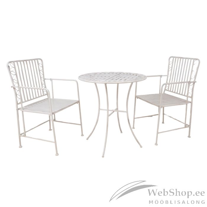 Rõdukomplekt JASMINE laud ja 2 tooli, antiikvalge metall. Laua mõõdud on D70xH75cm. Tooli üldmõõdud on 54x53xH92cm. Istme laius 49cm, istme sügavus 42cm, istme kõrgus 44cm. Käetoe kõrgus maast 68cm. Kaalupiirang 100kg. HOOLDUS JA HOIUSTAMINE: metallist mööbel on praktiliselt hooldusvaba, piisab regulaarsest puhastamisest. Suvehooaja lõppedes soovitame aiamööblit hoiustada siseruumides. Puhastage ja kuivatage mööbel enne hoiule panekut. Kasutage hoiustamiseks kuiva ning hea ventilatsiooniga ruumi.