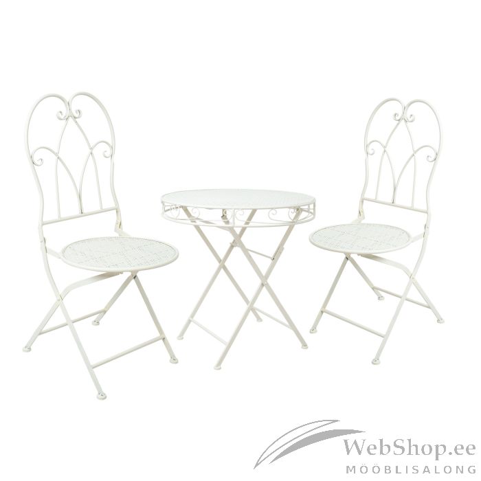 Rõdukomplekt SANDY laud ja 2 tooli, kokkupandav, antiikvalge. Laud ja toolid on valmistatud metallist ja viimistletud pulbervärviga. Laua mõõdud on D70xH73cm, tooli mõõdud on 41x54xH93cm. Kokkupanduna võtavad laud ja toolid vähe ruumi ning neid on lihtne hoiustada ja teisaldada. HOOLDUS JA HOIUSTAMINE: metallist mööbel on praktiliselt hooldusvaba, piisab regulaarsest puhastamisest. Suvehooaja lõppedes soovitame aiamööblit hoiustada siseruumides. Puhastage ja kuivatage mööbel enne hoiule panekut. Kasutage hoiustamiseks kuiva ning hea ventilatsiooniga ruumi.