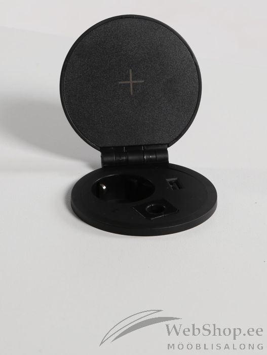 Must, kaanega rosett. Pesa sees on juhtmevaba laadija, pistik ja USB-laadija kõrval.