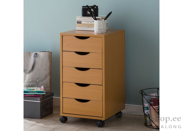 Kaasaegse ja ajatu disainiga sahtliboks. Boks on valmistatud melamiinkattega mööbliplaadist. Viimistlus: pöök. 5 metallist siinidel sahtlit asjade paigutamiseks. 4 ratast, et boksi oleks võimalikult lihtne mööda tuba liigutada.