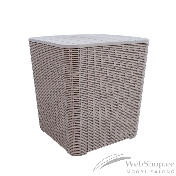 Säilituskast BOCAS hall. Mitmekülgne säilituskast pakub hea lahenduse vajaliku hoiustamiseks. Samas on seda võimalik ka abilauana kasutada. Kasti viimistlus meenutab rotangi disaini ja selle kaas puidu tekstuuri. Toode on heitlikes ilmastikuoludes vastupidav ning UV-kaitsega. Plastikust konstruktsioon on tugev ning ei mulju kergesti. Materjal ei roosteta ega kooru. Toodet on lihtne kokku panna. Toote mõõdud on 38,9x38,9xH42cm.