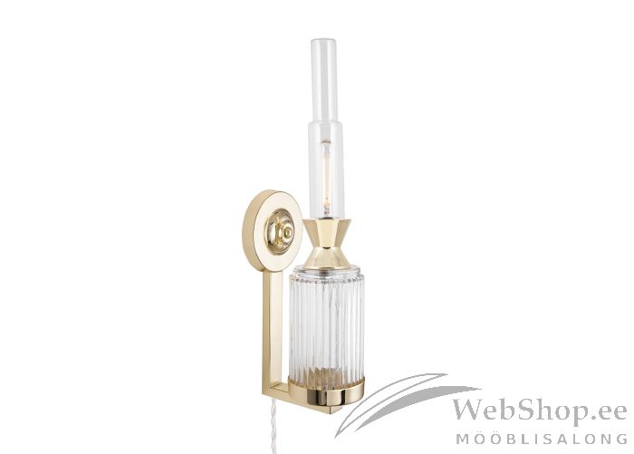 Läbipaistvast klaasist ja messingu tooni metallist seinalamp. Lambil on tekstiilist kaabel (200cm). Lüliti asub kaabli küljes. Lambile sobib elektripirn max 40W, sokliga E14. Valgusallikas ei kuulu komplekti. Skandinaavia disain.