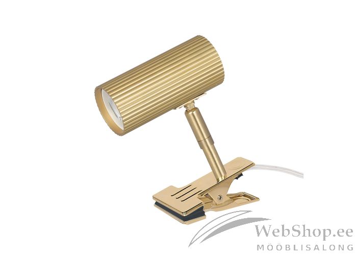 Modernses stiilis klamberkinnitusega seinalamp. Valmistatud harjatud messingu värvi metallist. Kupli suund on reguleeritav. Sobib elektripirn max 28W, sokliga GU10. Valgusallikas ei kuulu komplekti. 200cm kaabel, lülitiga. Skandinaavia disain.