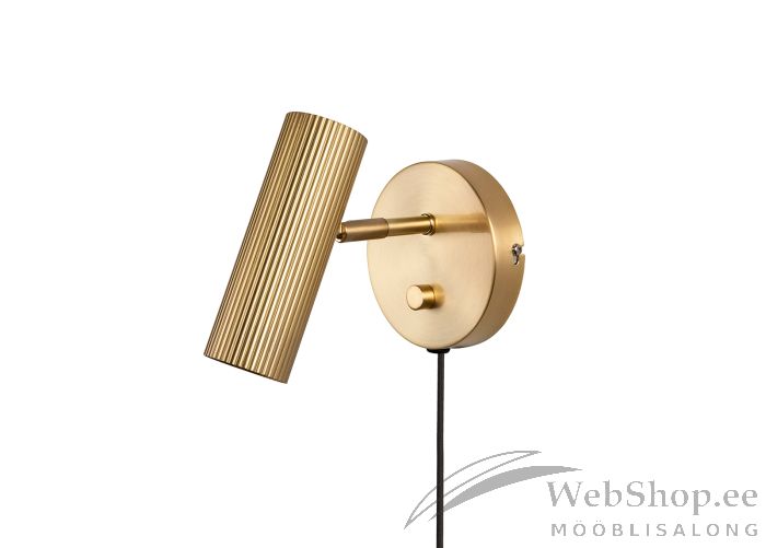 Harjatud messingu tooni metallist seinalamp. Must tekstiilist kaabel (200cm). Lambile sobib elektripirn max 28W, sokliga GU10. Valgusallikas ei kuulu komplekti. Lüliti asub lambi peal. Lamp on suunatav. Skandinaavia disain.