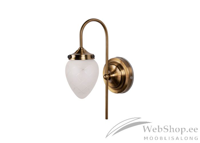 Jäisest klaasist kupliga seinalamp. Harjatud messingust raam. Lambile sobib elektripirn max 40W, sokliga E14. Valgusallikas ei kuulu komplekti. IP44. Lamp kinnitatakse juhtmetega otse seina. Valgustugevuse reguleerimise võimalus seinalülitist. Skandinaavia disain.