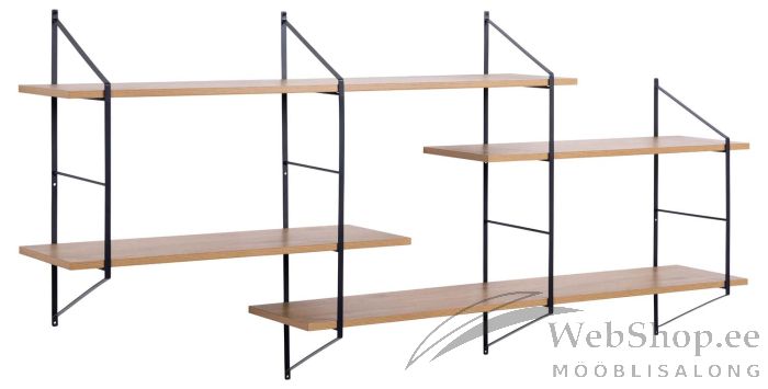 Moodne kerge ilmega seinariiul. Inspireeritud tööstusliku ja japandi stiili segust. Asümmeetriline detail lisab visuaalset huvitava nüansi. 4 reguleeritavat tamme välimusega riiulit. Peen must pulbervärvitud metallraam. FSC™ sertifikaat. Toote mõõdud on 191x25,5xH79cm.
