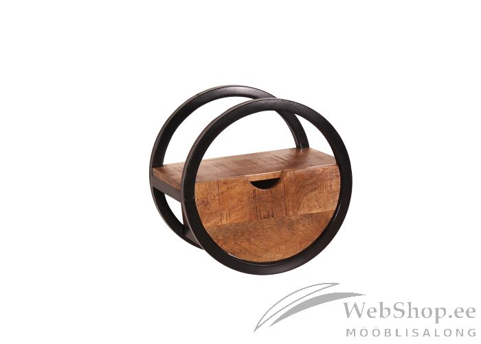 Naturaalsest mangopuidust ning musta värvi metallist stiilne seinariiul sahtliga.
