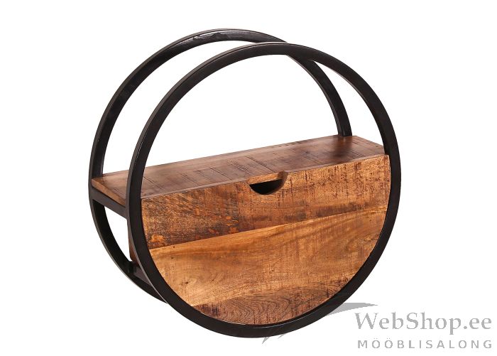Naturaalsest mangopuidust ning musta värvi metallist stiilne seinariiul sahtliga.