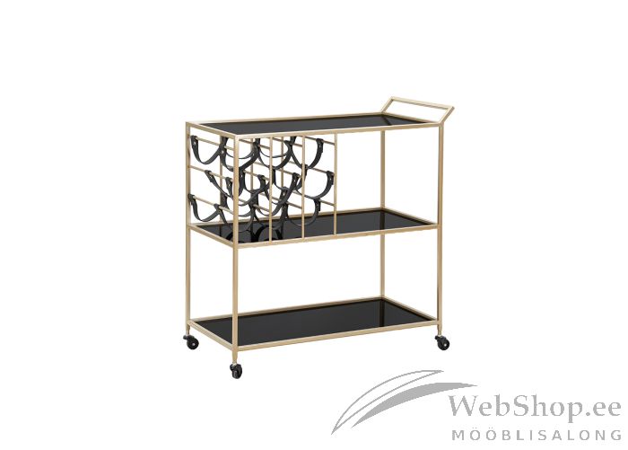 Elegantne serveerimislaud ratastel pudelihoidjaga. Laua karkass on kuldset värvi metallist ning musta värvi klaasriiulitega. Pudelihoidja mahutab kuni 9 pudelit.