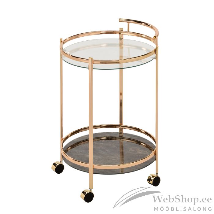 Serveerimislaud GENUA kuldne. Maitsekas ning mugavalt kasutatav serveerimislaud on abiks igapäevaselt, kuid muudab ka kodus võõrustamise hõlpsamaks. Laua riiulid on valmistatud 5mm paksusest karastatud klaasist. Ülemine riiul on läbipaistav ning alumine on kaetud luksusliku marmormustriga. Terastorud on viimistletud elegantses kuldses toonis. Serveerimislaual on neli ratast selle mugavamaks liigutamiseks. Laua mõõdud on 52x52xH79cm.
