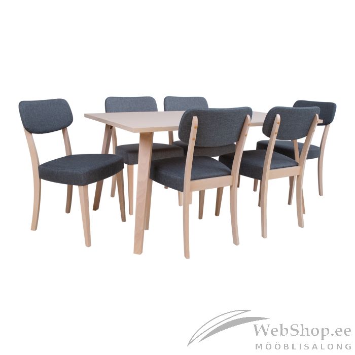 Söögilauakomplekt ADORA 6-tooliga. Söögilaud ADORA 150x90xH73cm. Lauaplaat on valmistud kärgplaadist ja kaetud naturaalse pöögispooniga. Lauaplaadi paksus 25mm. Jalad ja raam on valmistatud täispöögipuidust. Laud on viimistletud puidu toonis valge lakiga. Tool ADORA 49x58xH85,5cm, istme kõrgus 50cm. Tool on valmistatud täispöögipuidust. Iste ja seljatugi on polsterdatud ja kaetud halli polüesterkangaga. Puidust osad on viimistletud puidu toonis valge lakiga. Kaalupiirang 100kg.