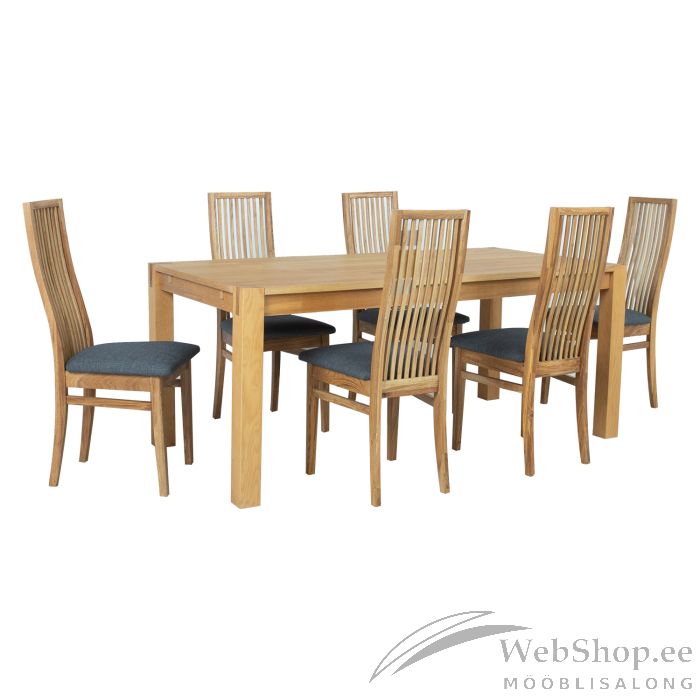 Söögilauakomplekt CHICAGO NEW 6-tooliga (19923). Laua mõõdud on 180x90xH76cm. Lauaplaat: MDF naturaalse tamme spooniga. Lauajalad ja raam on valmistatud madalama klassi täispuidust ja kaetud tammespooniga. Lauajala mõõdud on 8x8cm. Lauale on võimalik juurde osta pikendus 45x90cm koodiga 84026. Pikendus on võimalik paigaldada laua mõlemasse otsa. Laud on viimistletud naturaalses toonis puiduõliga. Tooli mõõdud on 46x56xH103cm, istme kõrgus 47cm. Tooli jalad ja raam on valmistatud täistammepuidust ja õlitatud. Polsterdatud iste on kaetud halli polüesterkangaga. Kaalupiirang 100kg.