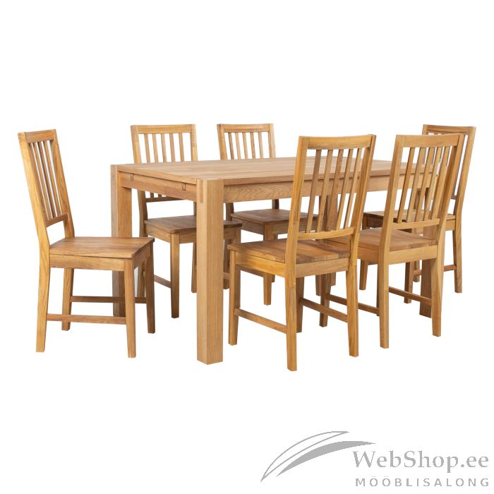 Söögilauakomplekt CHICAGO NEW laud 140x90xH76cm, 6 tooli (19954). Laud 140x90xH76cm. Lauaplaat: MDF naturaalse tammespooniga. Lauajalg 8x8cm, täispuit. Lauale on võimalik juurde osta pikendus 45x90cm koodiga 84026. Pikendus on võimalik paigaldada laua mõlemasse otsa. Tool 43x42xH94cm, puit: tamm, viimistlus: õlitatud.