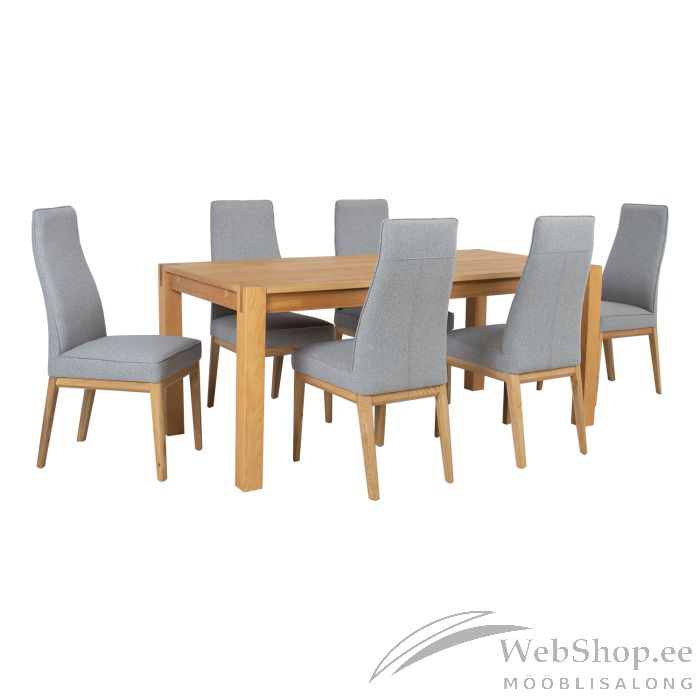 Söögilauakomplekt CHICAGO NEW laud 180x90xH76cm, 6 tooli (19968). Laud 180x90xH76cm. Lauaplaat: MDF naturaalse tamme spooniga. Täispuidust lauajalg 8x8cm on kaetud tammespooniga. Lauale on võimalik juurde osta pikendus 45x90cm koodiga 84026. Pikendus on võimalik paigaldada laua mõlemasse otsa. Tool PRESTON 46x58,5xH102cm, hall kangas, tammepuidust jalad. Kattematerjal: 100% polüesterkangas. Kaalupiirang 100kg.