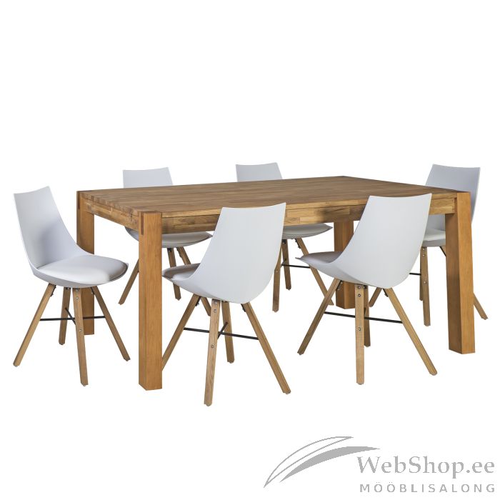 Söögilauakomplekt CHICAGO NEW laud, 6 tooli (37021). Laud 180x90xH76cm. Lauajalg 8x8cm. Täispuidust jalad on valmistatud madalama hinnaklassi lehtpuust ning kaetud tammespooniga. Lauapikendust 45x90cm saab osta eraldi koodiga 84026. Tool SEIKO 47x55xH80cm, iste: plastik/kunstnahk, värvus: valge, tammepuidust jalad. Kaalupiirang: 100kg.