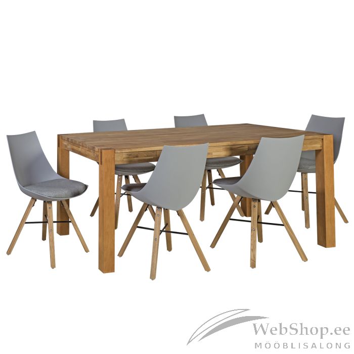 Söögilauakomplekt CHICAGO NEW laud, 6 tooli (37022). Laud 180x90xH76cm. Lauajalg 8x8cm. Täispuidust jalad on valmistatud madalama hinnaklassi lehtpuust ning kaetud tammespooniga. Lauapikendust 45x90cm saab osta eraldi koodiga 84026. Tool SEIKO 47x55xH80cm, iste: plastik/kangas, värvus: helehall, tammepuidust jalad. Kaalupiirang: 100kg.
