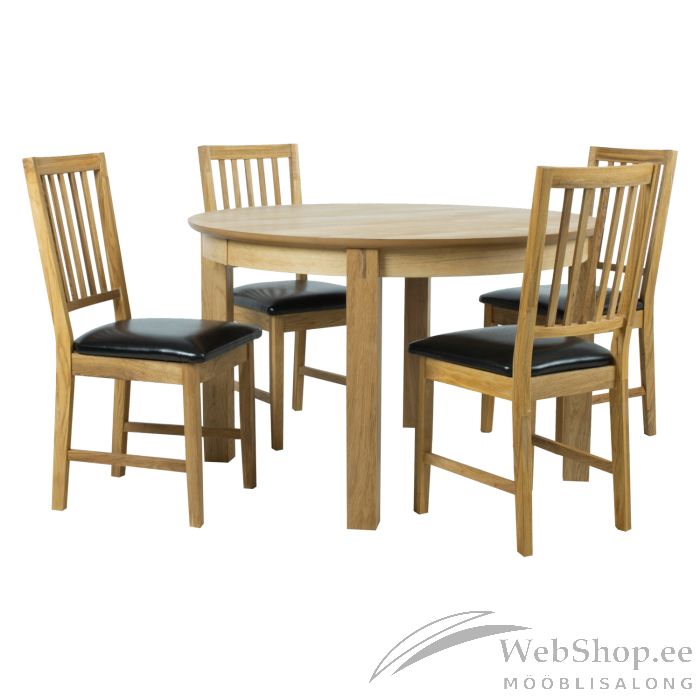 Söögilauakomplekt CHICAGO NEW ümmargune laud, 4 tooli (19951). Pikendatav söögilaud D120/160x120xH75cm, laua keskele saab lisada pikenduse 40x120cm. Lauaplaat: MDF naturaalse tammespooniga. Lauajalad (8x8cm) ja raam on valmistatud täispuidust ja kaetud naturaalse tammespooniga. Viimistlus: õlitatud. Tool GLOUCESTER 43x42xH94cm, musta kunstnahaga kaetud polsterdatud iste, täistammepuidust jalad ja raam, õlitatud.