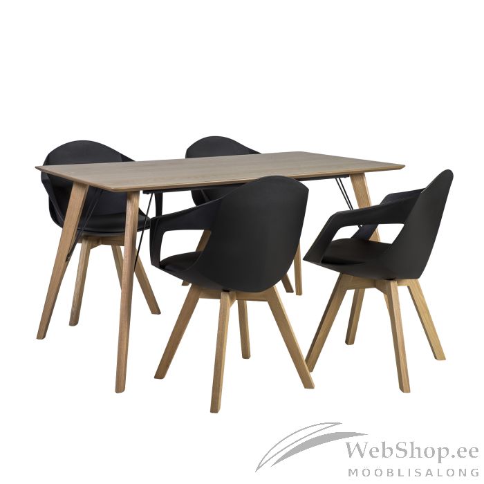 Komplekti kuulub laud ja 4 tooli. Laua mõõdud 140x80xH74cm. Lauaplaat 18mm MDF plaat kaetud naturaalse tammespooniga, lakitud. Tammepuidust jalad metallist tugevdustega. Tool STUART 58x57xH82cm. Mugava vormiga plastikust iste. Polsterdatud istmepõhi on kaetud kunstnahaga. Kaalupiirang 100kg.