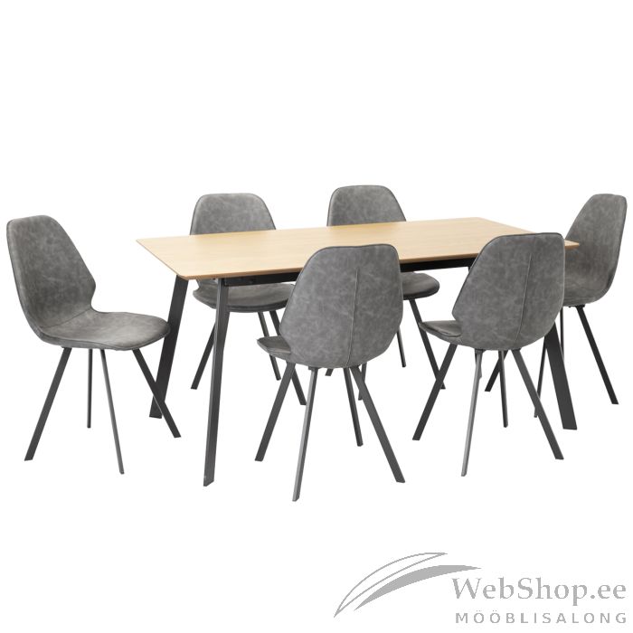 Komplekti kuulub laud ja 6 tooli. Laua mõõdud 160x90xH75cm. Lauaplaat: 18mm MDF naturaalse tammespooniga, lakitud. Metallist jalad on värvitud musta pulbervärviga. Tool 50x46xH82cm, hall kunstnahk, mustad metallist jalad. Kaalupiirang 100kg.