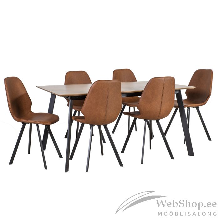 Komplekti kuulub laud ja 6 tooli. Laua mõõdud 160x90xH75cm. Lauaplaat: 18mm MDF naturaalse tammespooniga, lakitud. Metallist jalad on värvitud musta pulbervärviga. Tool 50x46xH82cm, pruun kunstnahk, mustad metallist jalad. Kaalupiirang 100kg.