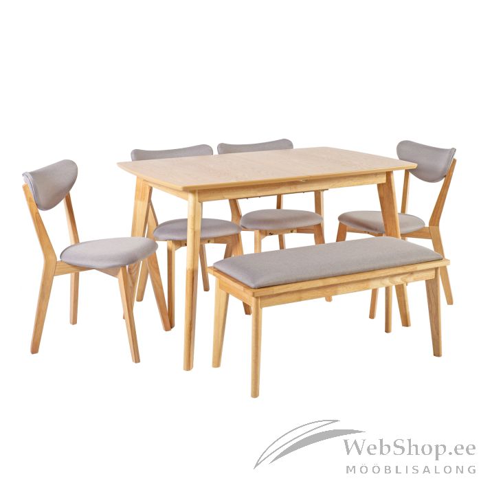 Laud 120/160x80xH76cm. Laud on keskelt pikendatav. 40cm laiune keskelt kokku klapitav pikendusosa asub lauaplaadi all. Tool 48,5x51,5x78,5cm, halli kangaga kaetud iste ja seljatugi, jalad ja raam: kummipuu, värvus: naturaalne. Pink 92x40xH45cm, halli kangaga kaetud iste, jalad ja raam: kummipuu, värvus: naturaalne.