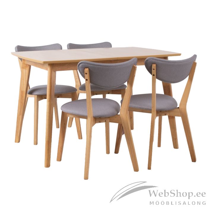 Laud 120/160x80xH76cm. Lauaplaat: MDF tammespooniga, jalad ja raam: kummipuu. Laud on keskelt pikendatav. 40cm laiune keskelt kokku klapitav pikendusosa asub lauaplaadi all. Tool 48,5x51,5x78,5cm, halli kangaga kaetud iste ja seljatugi, jalad ja raam: kummipuu, värvus: naturaalne.