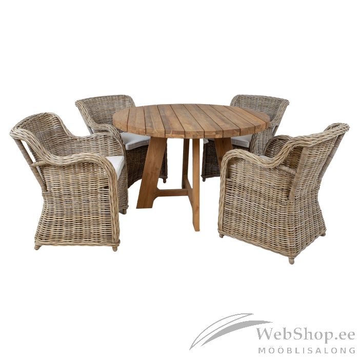Söögilauakomplekt KATALINA 4-tooliga. Laua mõõdud on D120xH78cm. Laud on valmistatud taaskasutatud tiigipuidust. Käsitööna valminud tooli raam on valmistatud painutatud rotangist ja kaetud üleni kubu rotangist punutisega. Istepadi kuulub komplekti. Tooli üldmõõdud on 62x62xH83cm. Tooli istmepadja mõõdud on 46x48xH5cm, istme kõrgus (koos padjaga) 50cm. Käetoe kõrgus maast on 67cm. Kaalupiirang 100kg. Rotangpunutise hall värvitoon on looduslik ja selle saavutamiseks ei ole kasutatud kunstlikke värvaineid. Rotangmööbel on aastaringselt kasutatav siseruumides ning sobib hästi katusega terrassile või klaasitud rõdule. Mööblit võib kasutada välitingimustes, kuid tuleb meeles pidada, et rotangmööbel ei ole ilmastikukindel.