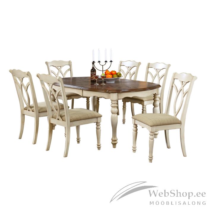 Söögilauakomplekt LILY laud, 6 tooli. Komplekti kuuluvad pikendatav laud ja kuus tooli. Laud on valmistatud tammespooniga MDF-ist ja kummipuust. Värvus: tamm, valge. Viimistlus: lakitud. Tooli iste on kaetud kangaga. Tooli jalad ja raam on valmistatud kummipuust. Värvus: antiikvalge. Laua mõõdud on 137/182x106,5xH76cm, tooli mõõdud on 49x63xH98cm.