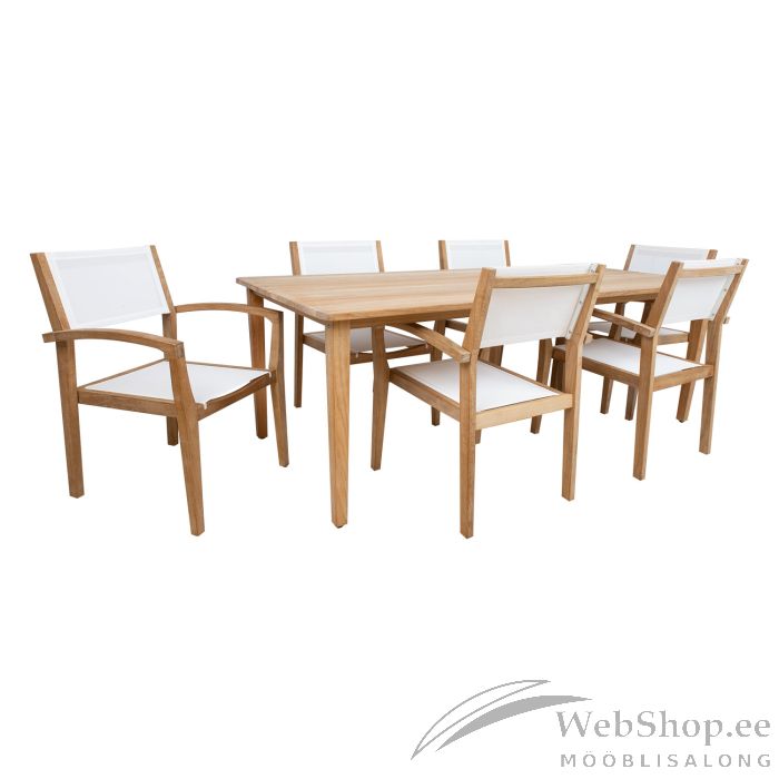 Söögilauakomplekt MALDIVE laud ja 6 tooli. Laua mõõdud on 220x100xH75cm. Laud on valmistatud hoolikalt valitud küpsest tiikpuust. Puidu peenlihvitud pind on täielikult naturaalne. Tänu suurele looduslike õlide sisaldusele on tiikpuu väga vastupidav niiskuse ning puidukahjurite suhtes ning ei vaja täiendavat viimistlemist või õlitamist. Tooli üldmõõdud on 62x62xH91cm. Istme laius 46cm, istme sügavus 52cm, istme kõrgus 45cm. Seljatoe kõrgus 49cm. Käetugede kõrgus maast 68cm. Toolid on virnastatavad. Tooli raam on valmistatud tiikpuust. Iste ja seljatugi on valmistatud valgest batylinest. Batyline materjali kõige olulisem omadus on selle nõtkus ja optimaalne istumismugavus. Lisaks erakordsele mehaanilisele tugevusele on materjalil kõrge keemiline vastupidavus. Sünteetiline kate tagab ülikõrge ilmastiku- ja UV-kindluse. Batyline ei ima niiskust, tänu sellele kuivab materjal väga kiiresti ja on maksimaalselt pleki- ja hallituskindel ning lihtsalt puhastatav. Tiikpuu talub väga hästi erinevaid ilmastikutingimusi ja säilitab oma suurepärase välimuse ja parimad omadused pikkadeks aastateks. Mida küpsem on puit, seda suurem on selle tihedus ja õli sisaldus ja seda vastupidavam ja stabiilsem on see ilmastikutingimuste suhtes. Päikesevalguse ja niiskuse mõjul muutub puidu pind aja jooksul kaunilt hõbehalliks. Selline värvimuutus on loomulik ning ei mõjuta puidu kvaliteeti. HOOLDUS: puhastage mööblit regulaarselt, kaitske liigniiskuse ja UV kiirguse eest. Puidust pindade värskendamiseks võib need soovikorral kergelt üle lihvida. Välitingimustes kasutatava mööbli eluea pikendamiseks soovitame kasutada välimööbli katteid. HOIUSTAMINE: suvehooaja lõppedes soovitame aiamööblit hoiustada siseruumides. Puhastage ja kuivatage mööbel enne hoiule panekut. Kasutage hoiustamiseks kuiva ning hea ventilatsiooniga ruumi.