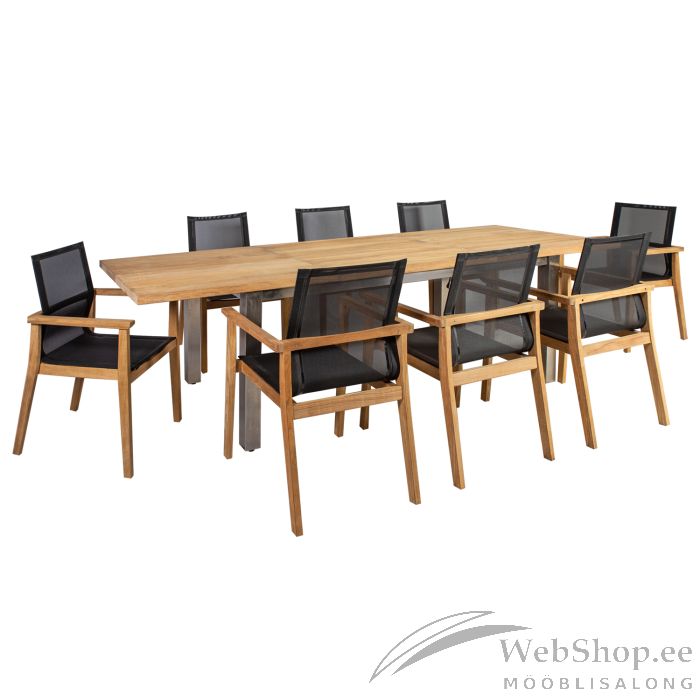 Söögilauakomplekt NAUTICA laud, 8 tooli (13259). Komplekti kuuluvad pikendatav laud ja kaheksa tooli. Lauaplaat on valmistatud täispuidust. Laud on keskelt pikendatav. 100cm laiune keskelt kokku klapitav pikendusosa asub lauaplaadi all. Tooli iste on musta värvi textiline´ist. Tooli jalad ja raam on valmistatud tiikpuidust. Viimistlus: peenlihvitud, õlitamata. Laua mõõdud on 200/300x100xH76cm, tooli mõõdud on 64x65xH90cm.