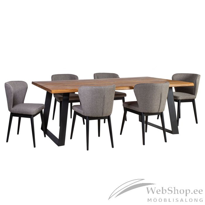 Söögilauakomplekt ROTTERDAM laud, 6 tooli (18103). Laud 220x100xH75cm. Lauaplaat: naturaalse rustik tammespooniga mööbliplaat. Laua äärtes täispuidust liistud. Lauaplaat koosneb kahest paneelist. Rustik spoon on kirju ja elava struktuuriga. Lubatud suur oks, pahteldatud lõhed ja rohke tooni varieerumine. Viimistlus: õlitatud. Tool LISBON 53,5x54xH81,5cm, kangaga kaetud polsterdatud iste ja seljatugi, värvus: hall, mustad puidust jalad.