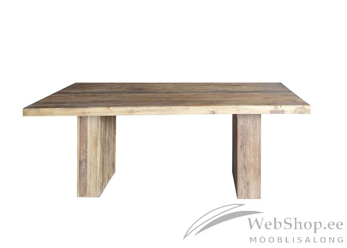 Naturaalsest taaskasutatud tiikpuust söögilaud. Laua keskel metallist dekoratiivne joon.