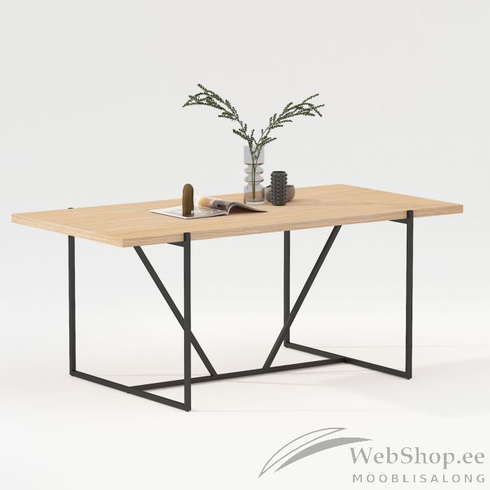 Söögilaud CINDY 160x90xH75cm, melamiin tamm. Lauplaat: hele tammedekooriga melamiinplaat. Laua jalad ja alusraam on valmistatud metallist ja viimistletud musta pulbervärviga.