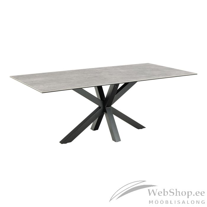 Kaasaegne julge välimusega söögilaud. Laua hallid toonid annavad sellele karge ilme. Lauaplaat on valmistatud kuuma- ja kriimustuskindlast keraamikast. Must skulptuurne metallist ristalus tagab stabiilsuse. Mahutab mugavalt 8 inimest. Toote mõõdud on 200x100xH75,5cm.