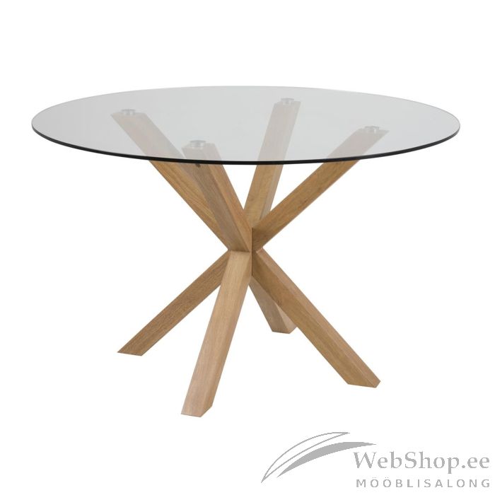 Söögilaua taga on mugavalt ruumi meeldivaks einetamiseks. Läbipaistvast klaasist lauaplaadi ja tammetoonis alusega laud on kaasaegse ilmega. Tänu kergesti hooldatavatele materjalidele on söögilaud täiuslik lisandus igasse koju. Lauaplaat: 10mm karastatud klaas; jalad: metall, tamme toonis. Mõõdud on D120xH76cm.