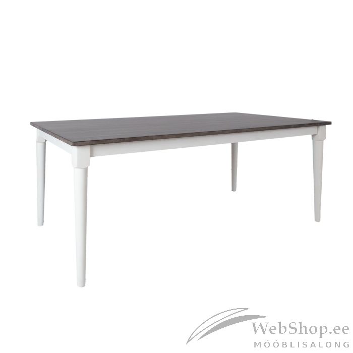 Söögilaud JANELLE 183x91xH75cm, hall/valge. Lauaplaat: halli värviga viimistletud mööbliplaat. Laua jalad ja raam on valmistatud kummipuust ja värvitud valgeks.