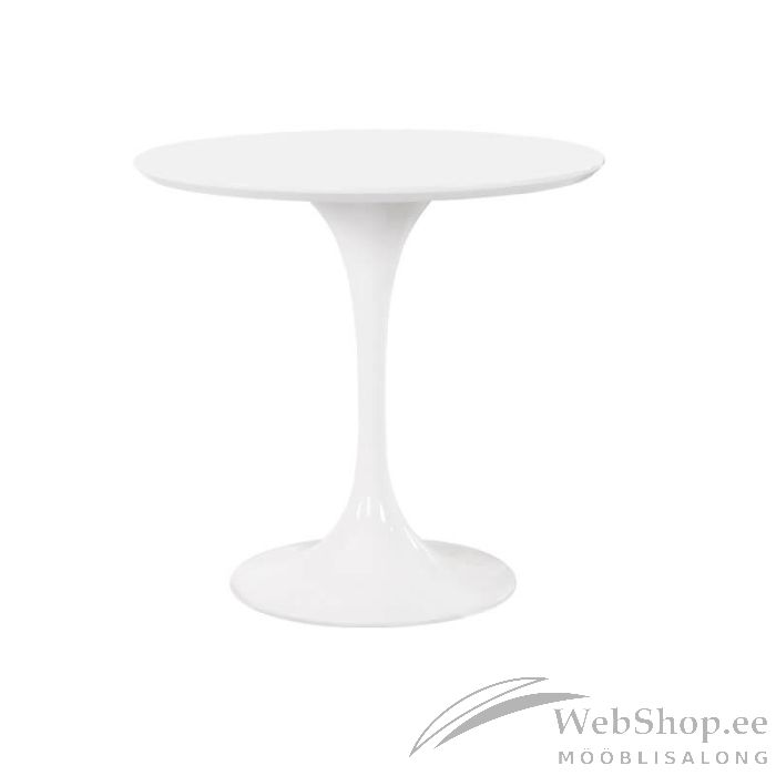 ümmargune valge laud lauaplaat on valmistatud MDF-plaadist jalg on valmistatud klaaskiust materjalide erinevuse tõttu võib esineda lauaplaadil ja -jalal väike värvitooni erinevus