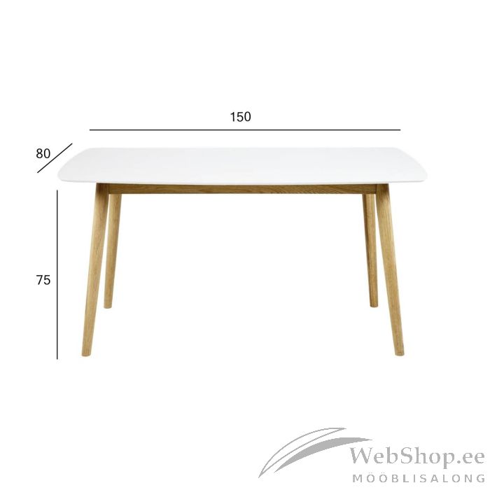 Söögilaud on lihtsa vormi ja loomuliku välimusega. Ümarad servad muudavad disaini soojemaks. Valge värvi ja tammepuidu kombinatsioon suurendab hubase atmosfääri teket. Lauaplaat: MDF, värvus: valge; jalad: puit. Mõõdud on 150x80xH75cm.